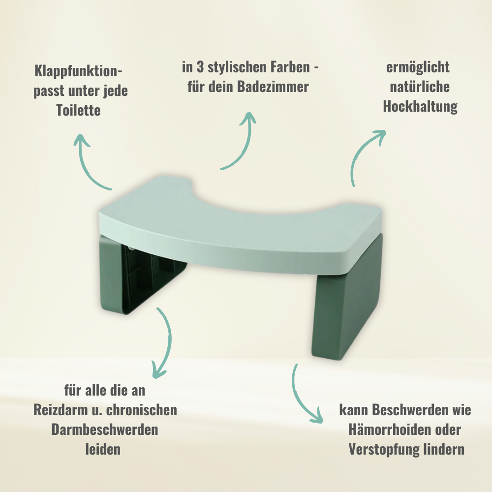 Durch die Hockposition kommt der Darm in die Streckung, was den Stuhlgang spürbar erleichtert. Kein unnötiges Pressen mehr – es geht schneller und sanfter. Der Darm kann sich vollständig entleeren. Wirkt spürbar gegen Verstopfung, Blähbauch und Reizdarm. Mach Darmgesundheit zu deiner Priorität.